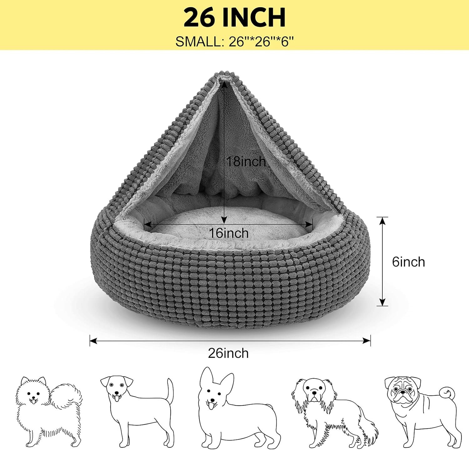 Dog Bed with Attached Blanket for Small Dogs or Cats, Soft Plush Cozy Donut Hooded Pet Beds Washable. Round Puppy Bed Orthopedic, Calming Cat Cave Bed. Anti-Slip Bottom 26inch